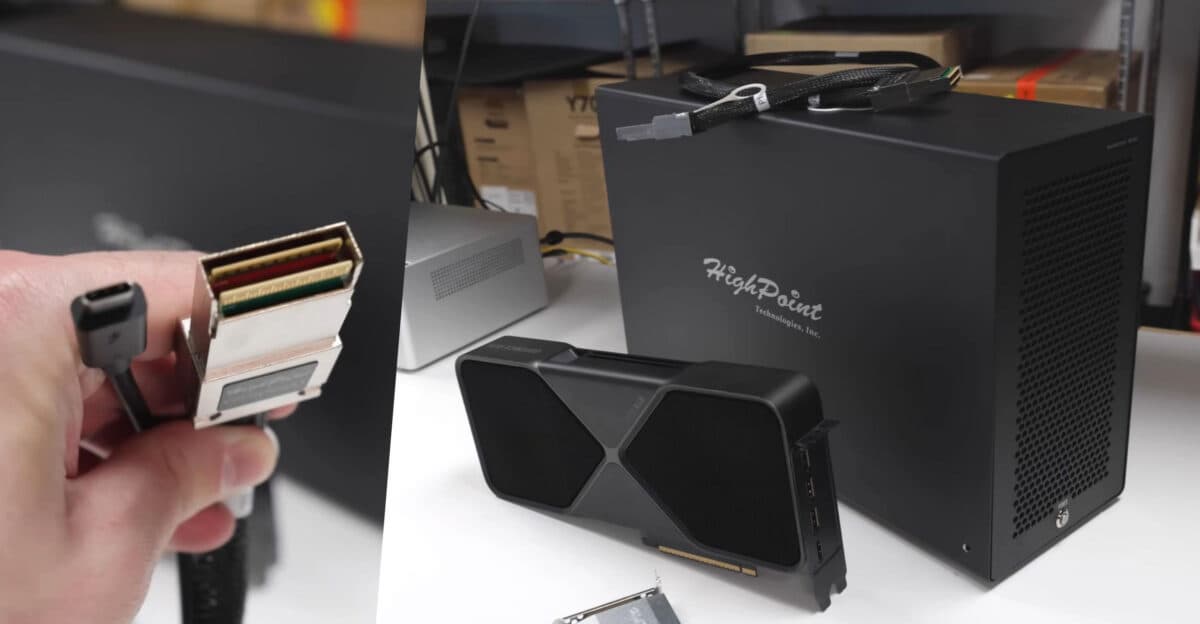 Авторы работали с корпусом HighPoint RocketStor 8631D, который оснащён не Oculink и даже не Thunderbolt, а использует использует CopprLink от PCI-SIG и выделенный хост-адаптер. Из-за размеров и цены на текущем этапе это неподходящее решение для потребительского сегмента, однако, возможно, в будущем появятся и более удобные и дешёвые варианты.